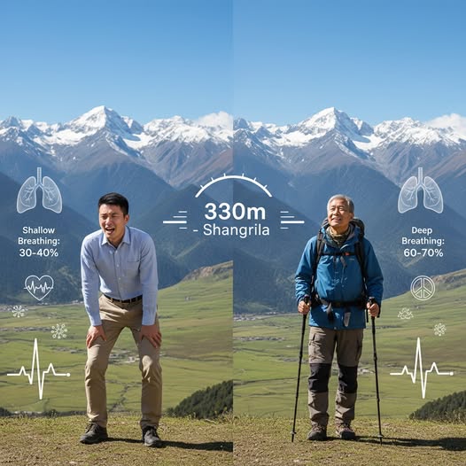 Ở độ cao 3300m (Shangrila): Nồng độ oxy vẫn là 21%, NHƯNG áp suất khí quyển chỉ còn ~70%